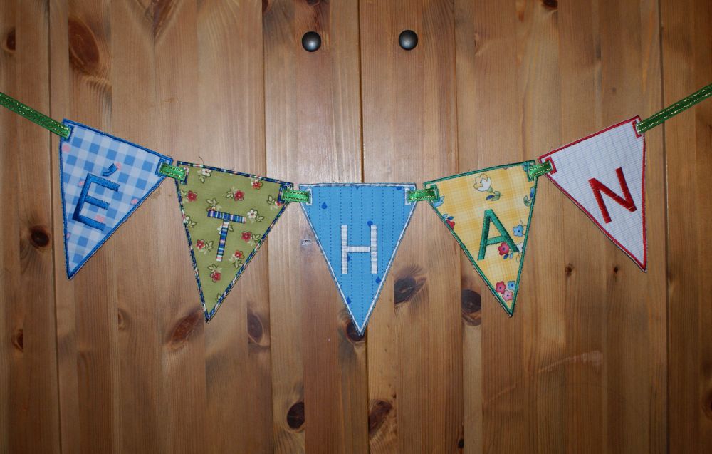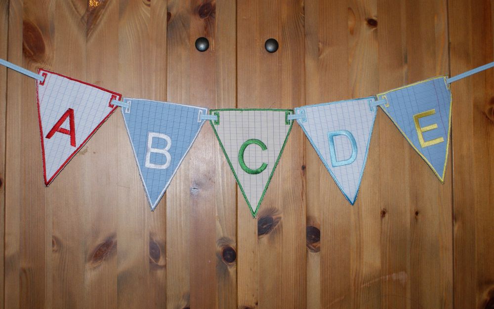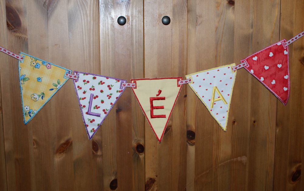Voilà des nouvelles choses, des drapeaux pour décorer les chambres des enfants, ils sont réalisés dans du tissu en coton très coloré et brodé à la machine :