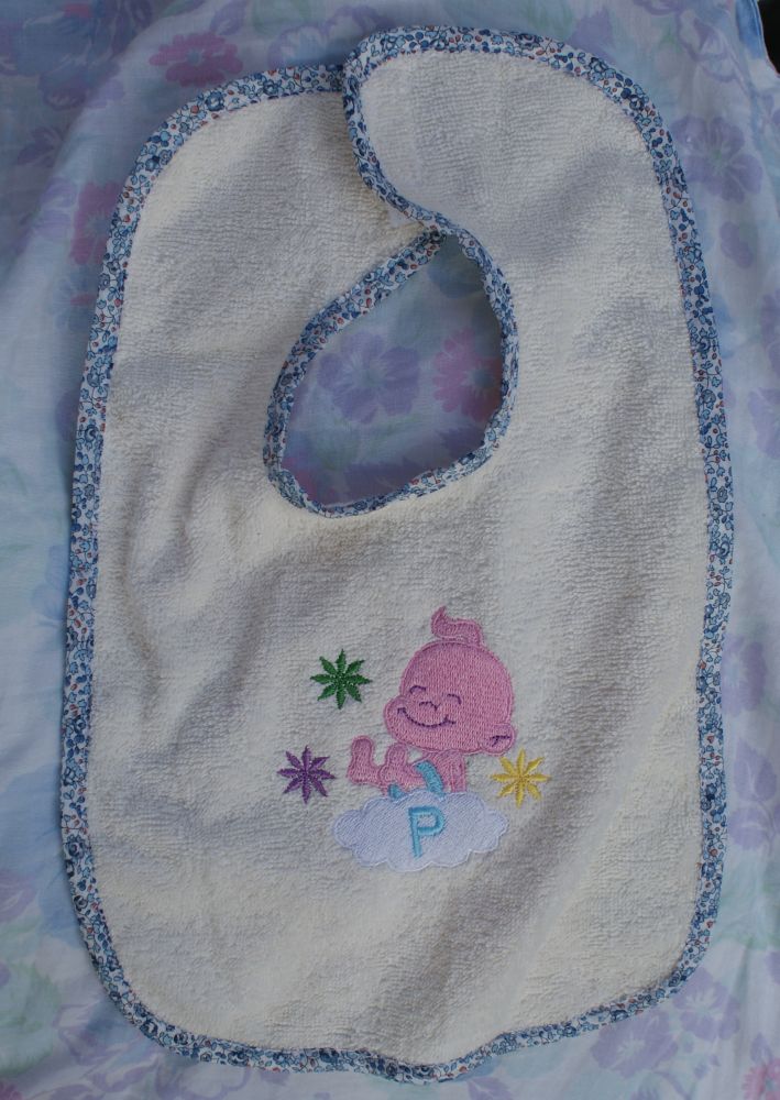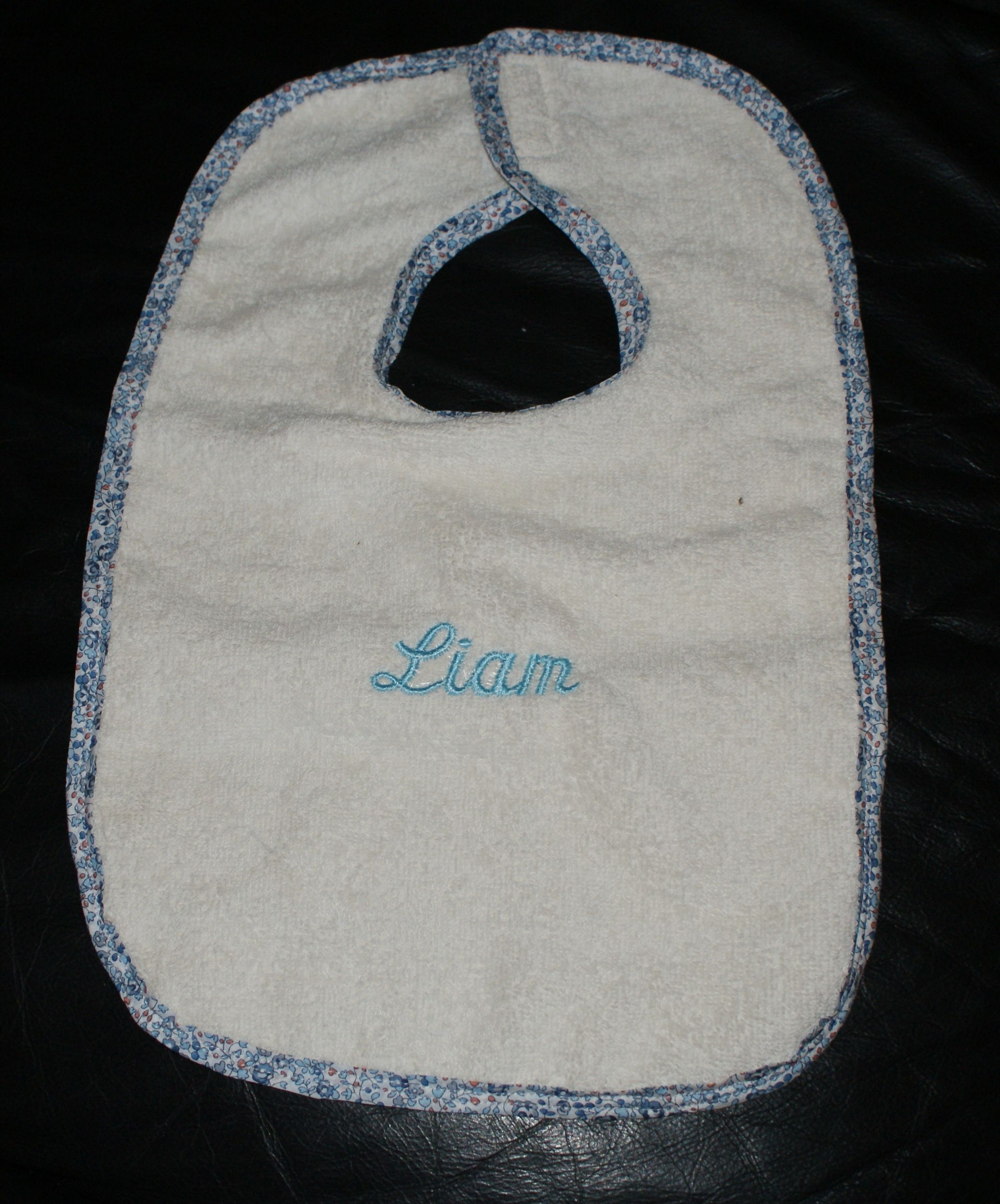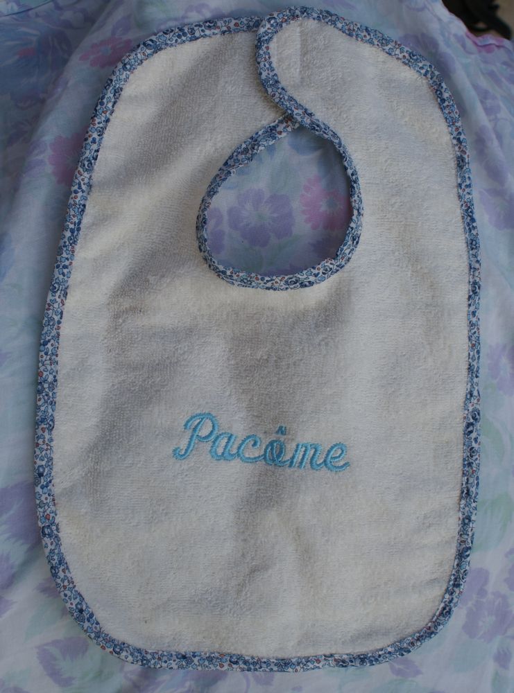 pour les cadeaux de naissance, j'ai fait des bavoirs avec du tissu éponge crème et un galon bleu car se sont deux garçons et j'ai brodé le prénom en bleu dessus.